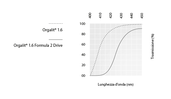 Le curve di trasmissione mostrano che rispetto a Orgalit®, Formula 2 Drive filtra una parte significativa della luce blu diffusa attraverso un filtro UV fino a 420 nm. In combinazione con il nostro design innovativo e lo speciale trattamento i-Protection® Blue GT, gli occhi sono protetti in modo ottimale contro l'abbagliamento.